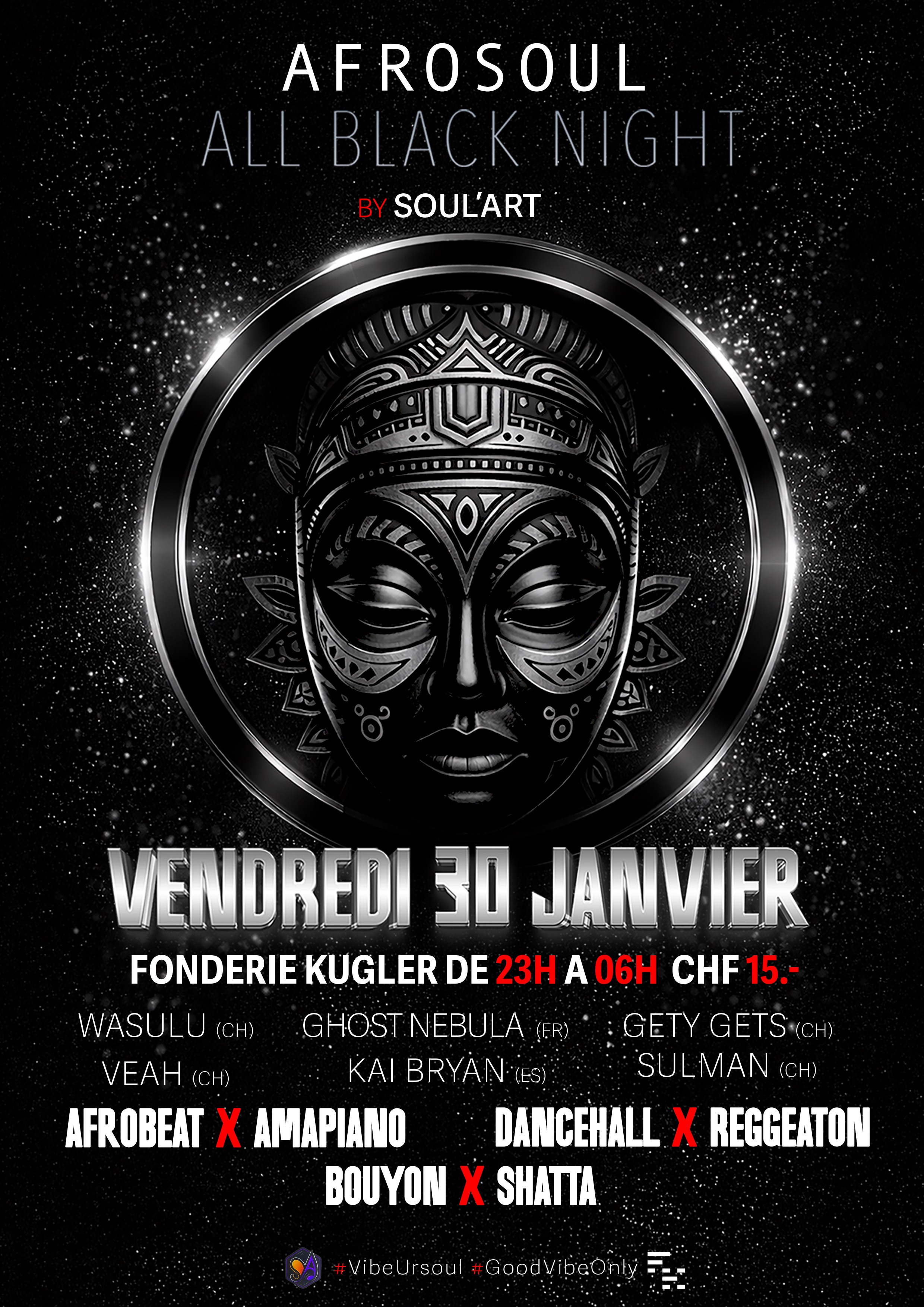 Vendredi 30 Janvier 2026 Fonderie Kugler – Genève 23h – 06h. CHF 15.- Achat de billets en ligne La nuit s’annonce sombre… et surpuissante. Une première édition signée @soularts_events , où élégance, énergie et culture afro s’entremêlent jusqu’à l’aube. Une seule règle : le noir, rien que le noir. @wasuluselecta Figure emblématique de la scène genevoise...