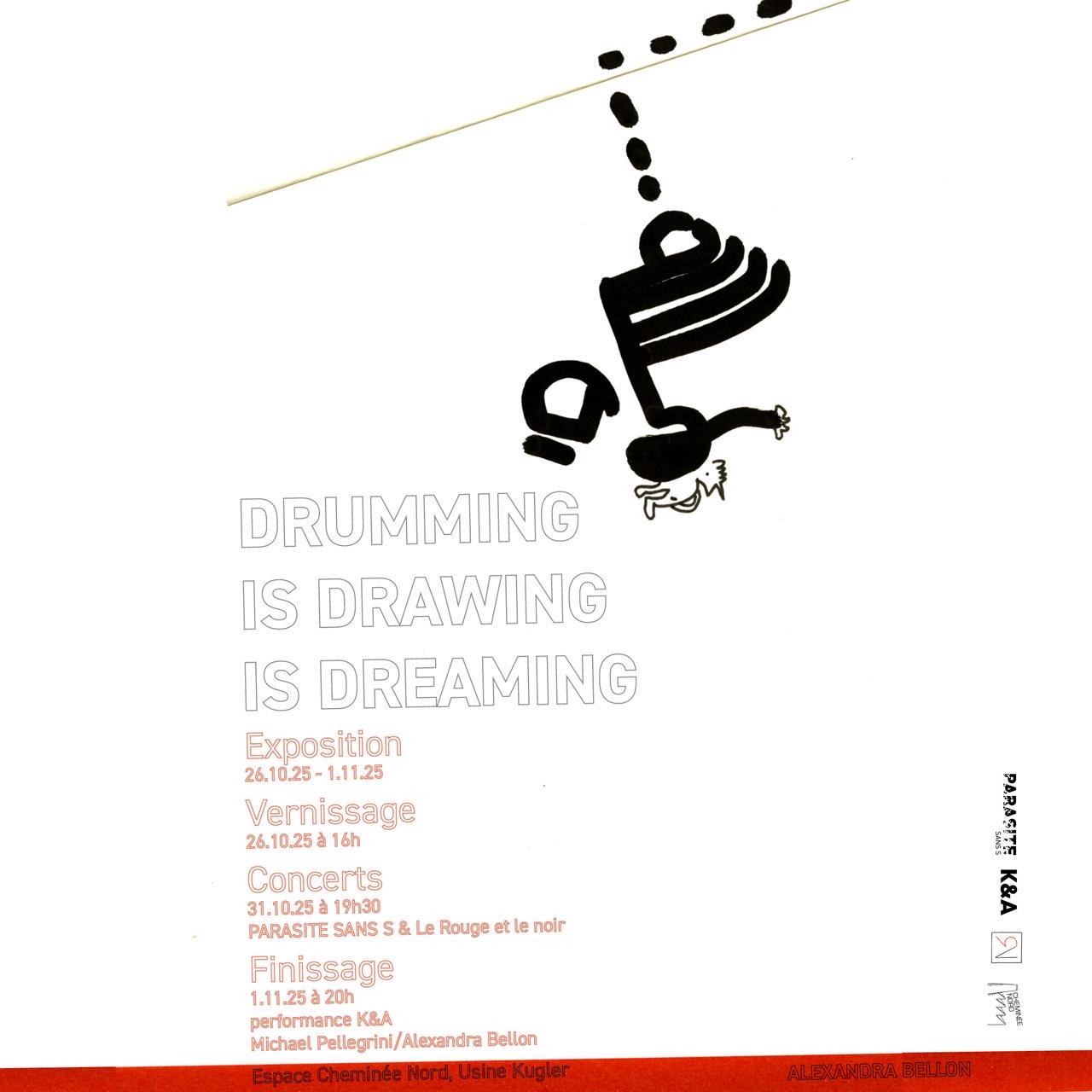 ESPACE CHEMINEE NORD Drumming is Drawing is Dreaming Dessins / Musique / Performances Alexandra Bellon avec la participation de K&A Vernissage : 26.10.25 - 16h Concert : 31.10.25 - 19h30 Parasite sans « S » puis Le Rouge et Le Noir Finissage : 1.11.25 - 20h Performance K&A puis Les Clones