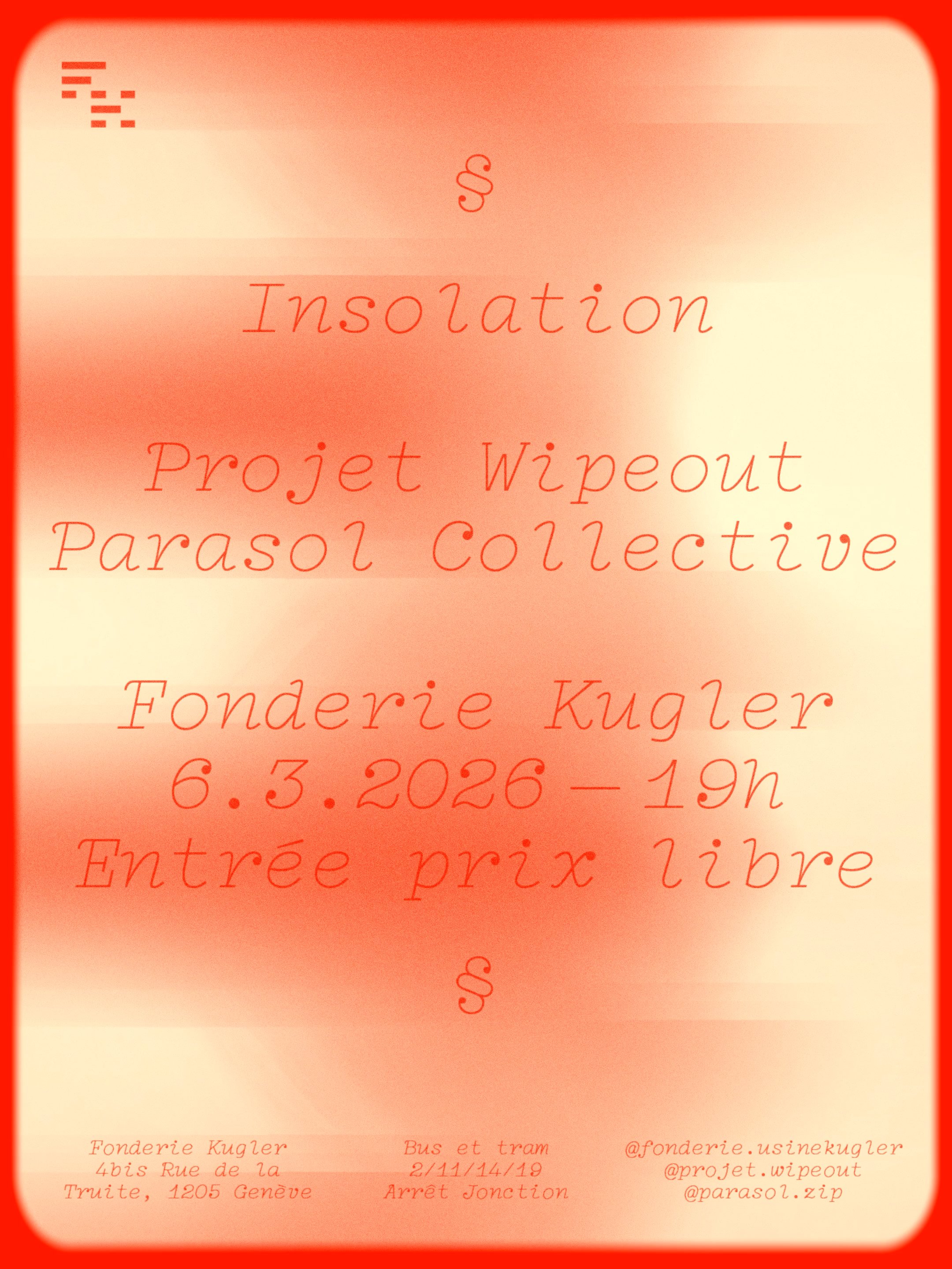 INSOLATIONDialogue en temps réel entre image et son. Vendredi 6 mars 2025Ouverture des portes : 19h00Performance : 20h00Fonderie Kugler, Genève Entrée prix libre en soutien aux artistes INSOLATION est une création live née de la rencontre entre le collectif de VJ Parasol et le collectif musical Projet Wipeout. Sur scène, musiciens et artistes visuels...